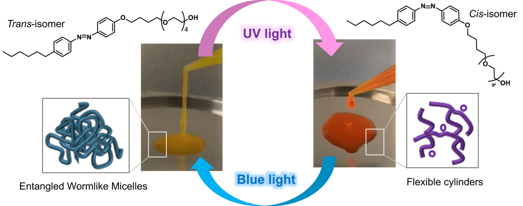 This paper reports an azobenzene photosurfactant, which at low concentrations in water, can reversibly switch between a high-viscosity, viscoelastic fluid and a watery, low-viscosity fluid, depending on the light irradiation conditions.