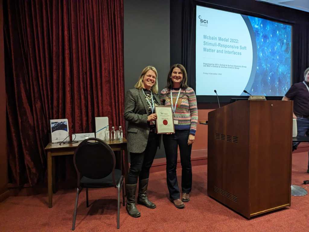 Rachel was awarded the Mcbain medal from the RSC/SCI Joint Colloid group at a dedicated symposium held in London on 9th December. The McBain Medal is presented annually to an early career researcher (within 15 years of the award of a PhD) for outstanding achievement in colloid and interface science. The symposium featured a series of fascinating talks and posters based around the theme of Stimuli-Responsive Soft Matter and Interfaces.
